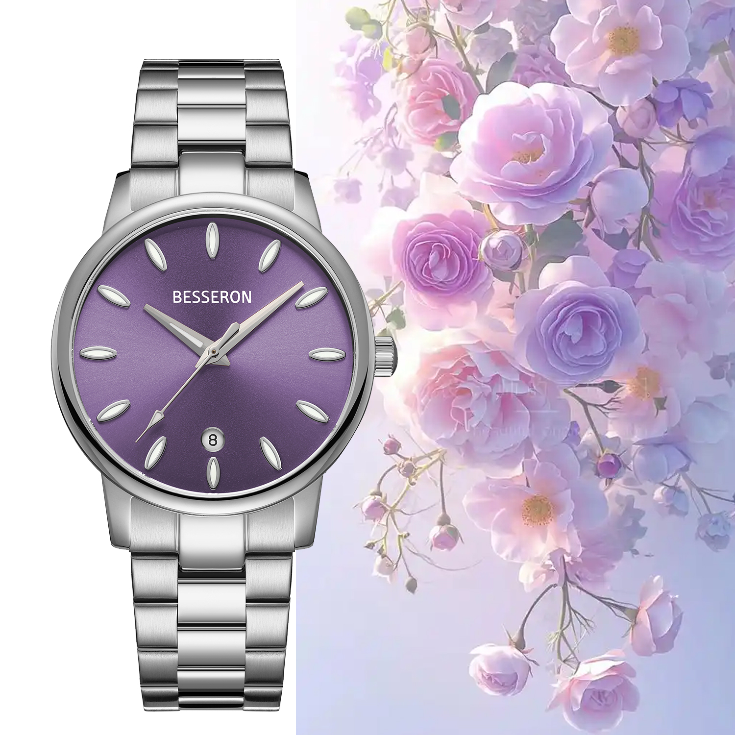 Besseron’s 36mm purple dial women’s watch combines elegance with practicality. Featuring a stainless steel band and precise analog display, this timepiece is designed for modern women seeking luxury and versatility. Perfect for daily wear or special occasions. Inspired by the timeless allure of twilight skies, the Besseron 36mm purple dial watch captures the mystique of nature in its design. Crafted for women who value both sophistication and practicality, this watch embodies the harmony of bold color and minimalist elegance.