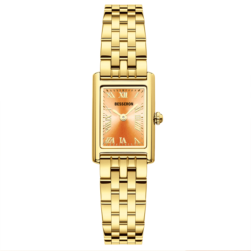 Inspired by modern women who embrace bold style, this watch combines classic elegance with contemporary design. The orange dial symbolizes energy and confidence, while the gold stainless steel exudes timeless luxury.