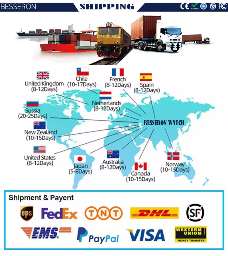 1. Custom LOGO on dial, back cover, band, buckle, and watch box. 2. Besseron watch manufacturer OEM for a Well-known brand . 3. Registered trademarks 4. Supplies Fortune 500 companies 5. 100+ production machines 6. Quick response time 7. 20+ Testing instruments 8. Professional designer, QA/QC team 9. BSCI, ISO 9001, CE, RoHS, FCC certificates 10. Finished products inspection