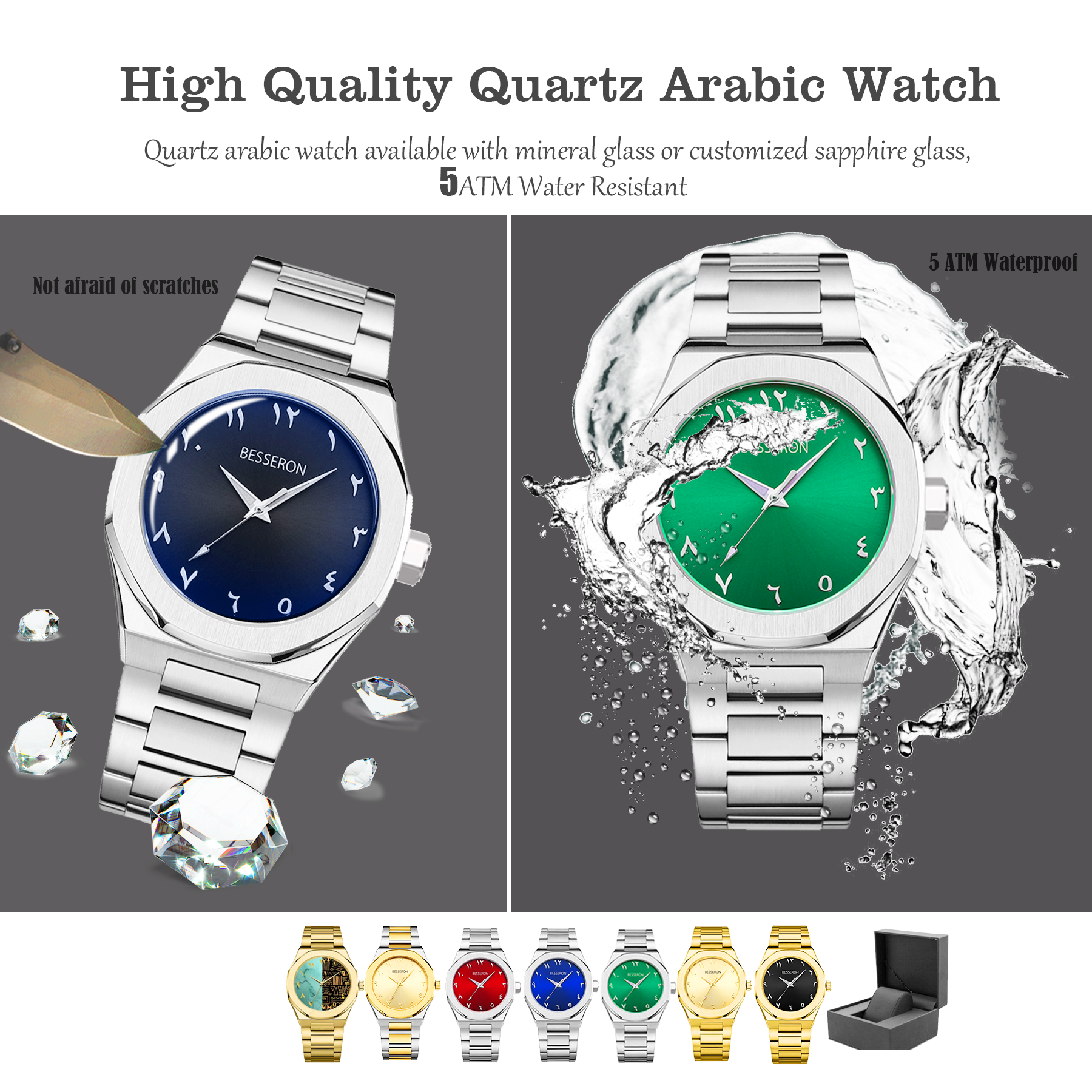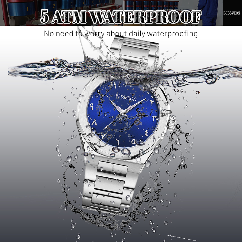 1. MOQ: 100pcs can mix colors and customize your brand logo on the Arabic watch dial, back case, buckle, and crown. 2. High quality: 316L stainless steel case with Japan movement and quicker release strap. 3 . Full Certificates: The watch has CE, ROSH2.0, FCC, REACH, and WEEE Certificates. 4 . Fast delivery: We have our own factory for more flexible delivery times.