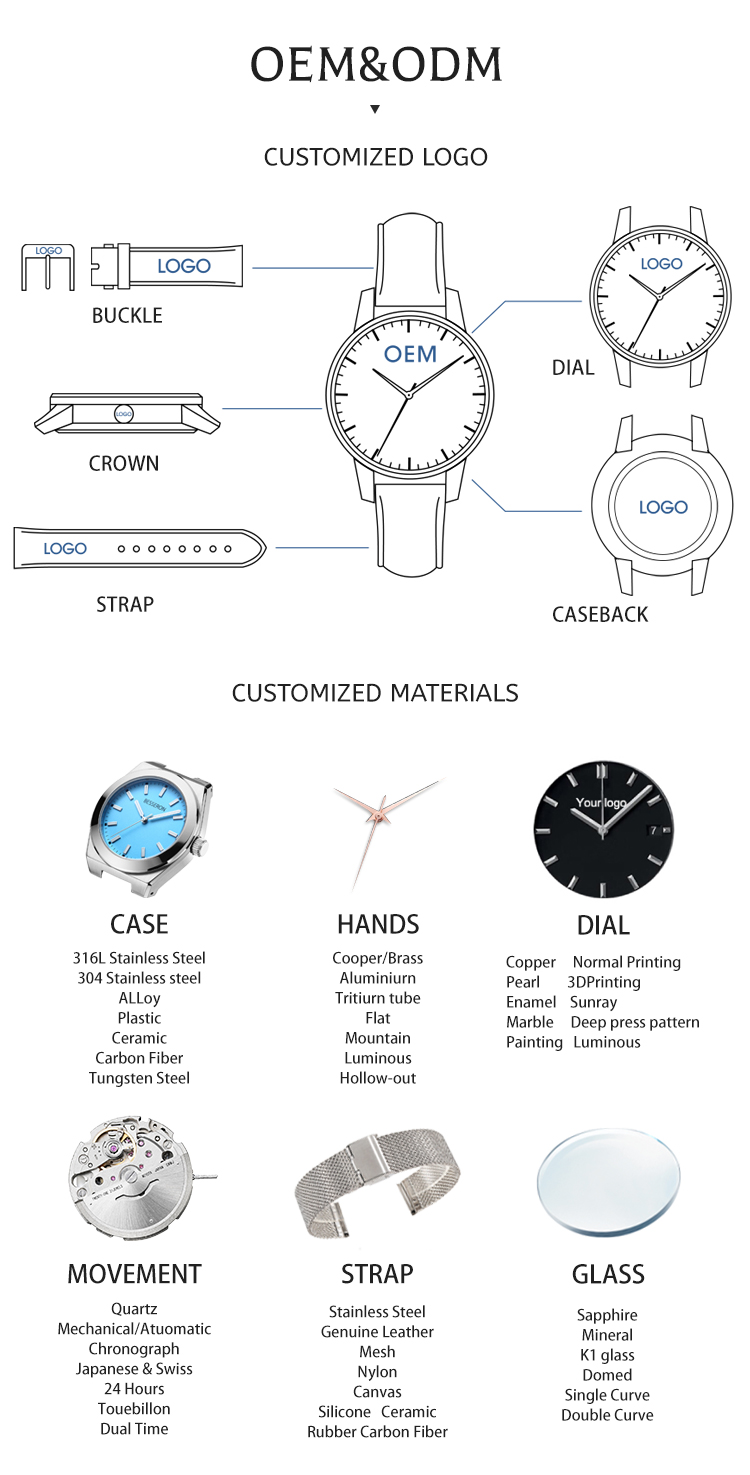 OEM ODM Men's Watch Luxury We can provide design, production, packaging, and other one-stop service Welcome to consult us 1. MOQ: 100pcs can mix colors and customize your brand logo on the Arabic watch dial, back case, buckle, and crown. 2. High quality: 316L stainless steel case with Japan movement and quicker release strap. 3 . Full Certificates: The Men's watch has CE, ROSH2.0, FCC, REACH, and WEEE Certificates. 4 . Fast delivery: We have our factory for more flexible delivery times. About us Besseron is a professional Chinese watch manufacturer specializing in OEM/ODM watch production with 60 years of heritage in the industry. The company focuses on providing comprehensive custom watch solutions including design, manufacturing, and assembly services for brands worldwide. FAQ 1. Q: What's the ordering process? A: Payment -----Mockup-----Machine drawing-----production----Quality check------Delivery 2. Q: How many quantities should I order to customise my logo? A: Our Watches models minimum order quantity is 100pcs per design we can custom your logo. 3. Q: Can I Mix The Straps If I order based on the MOQ? A: Yes, we have many bands for your choice, such as Brown and Black Genuine Leather, Gold, Rose Gold, Silver Mesh, and Black Metal Bands. 4. Q: About the after-sale service: A: We are confident in our products and pack them very well, so you will receive your order in good condition. But to avoid any Regarding the quality issue, we suggest that you check the watches as soon as you receive them, and let us know the details if there are any damaged ones, we will deal with it accordingly and immediately. 5. Q: Why did you choose us? A: We have a lot of models with brand logos; you can also check them on Instagram and Facebook; Production takes only 15~45 days depending on the designs.