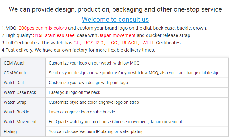 3.Can I customize our logo on the watch? Yes. We can print your logo on the dial, on the strap, on the buckle, etc. The minimum order quantity for a custom logo is 100pieces. If you need OEM or ODM, please contact us.We can provide design, production, packaging and other one-stop service.