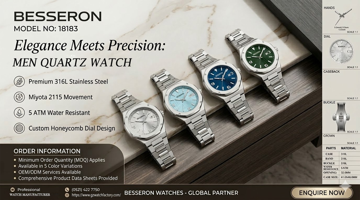 BESSERON is a company specializing in the research, development, salesand service of watches, We have a huge factory, aprofessional designteam and an experienced assembly team.From design, manufacturing,to assembly, every step is strictlytested and controlled, We will alwaysmeet the needs of ourcustomers and provide solutions for them.Why Choose Besseron? ✔ Wholesale – Ready-to-ship stock, MOQ 3-50 pieces. ✔ OEM/ODM Service – Custom logos, dials, straps accepted. ✔ Certified Quality – ISO9001, CE, RoHS compliant. ✔ 16+ Years Expertise – Trusted by EU/US brands. Ideal for luxury men's watches (Markenuhr, Herrenuhr) buyers seeking durable Quarzuhren at factory prices.Q1: Who Q1:Are you watch manufacturer ? A1: Yes,We are professional manufacturer of Watches with more than 16 years" experience. Q2: How can we guarantee quality? A2: Always a pre-production sample before mass production:Always final inspection before shipment. Q3:What can you buy from us? A3:Quartz Watchs; Mechanical Watches, Watches Parts, Pocket Watchs, Watches Case And Box Q4:Why should you buy from us not from other suppliers? A4:1.50 years experience inheritance of watches2.Supplier for 80% of European brand,99.5% customer satisfaction 3.Five Strict product inspections 4.Products obtained national patent 5.Main products:quarz wrist watches, pocket watches.ect Q5: What services can we provide? A5: Accepted Delivery Terms. FOB,ExW:Accepted Payment Currency:USD,EUR,HKD.CNY:Accepted PaymentType: T/T,L/C,PayPal;Language Spoken:English,Chinese Q6:Can We Put My own Logo on Watch? A6:Yes, we can Put Your Logo On Dial, Strap, Buckle, Back Case. Q7:Can l Mix The straps lf l order 50~100pcs? Yes, We have many bands for your choice, such as Brown and Black Genuine Leather, Gold,Rose Gold AndSilver Mesh and Black Metal Bands. A8: Why Choose the popular men watch ? The popular men watch is not just a wrist watch; it is a symbol of excellence. It combines the best features of a classic watch with the durability of a men's stainless steel watch. Whether you are looking for luxury men watches or a reliable 42mm watch, the popular men watch stands out as a top contender.