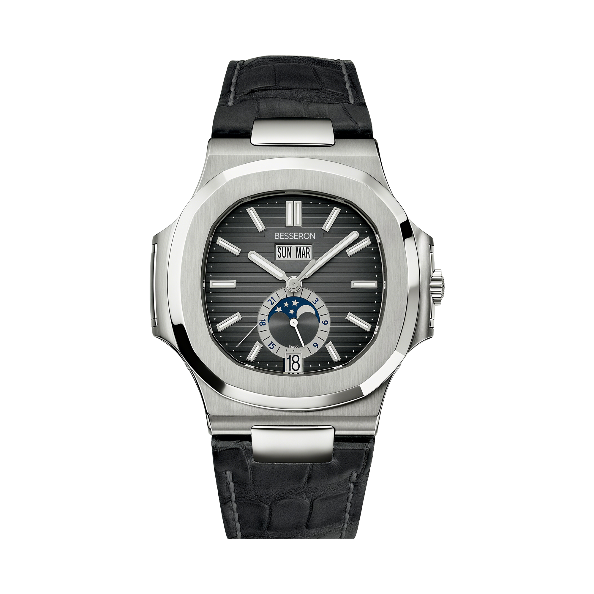 Crafted for discerning gentlemen, this timepiece features a sophisticated square stainless steel case and integrated bracelet, ensuring enduring structural integrity. The sapphire crystal dial window—renowned for exceptional scratch resistance (>9 Mohs hardness) and optical clarity—maintains pristine visibility while protecting against daily wear. Each component undergoes meticulous finishing to achieve a flawless aesthetic.
