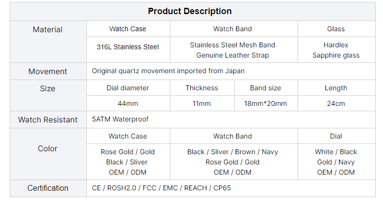4.About the movement We can supply Japanese movements, imported watch movements. We make sure to provide high quality and high precision movements.