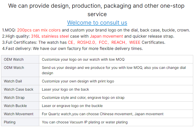 3.Can I customize our logo on the watch? Yes. We can print your logo on the dial, on the strap, on the buckle, etc. The minimum order quantity for a custom logo is 100pieces. If you need OEM or ODM, please contact us.We can provide design, production, packaging and other one-stop service.