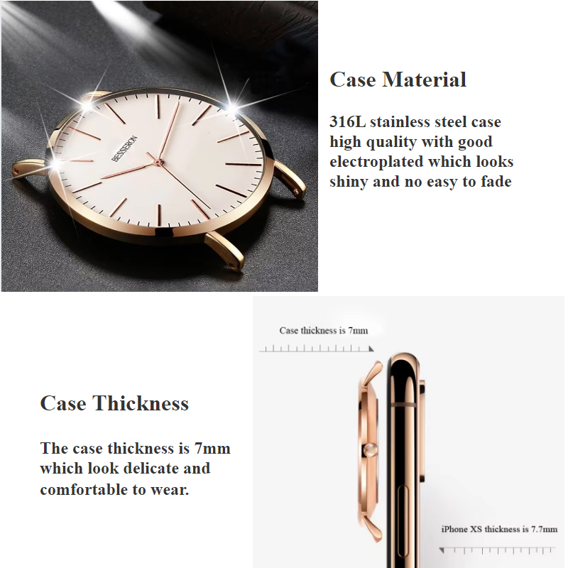 Minimalist Design Ultra-thin profile (8.5mm) with minimalist hour markers. Color Options: Midnight Black, Vintage Brown, Rose Gold accents.