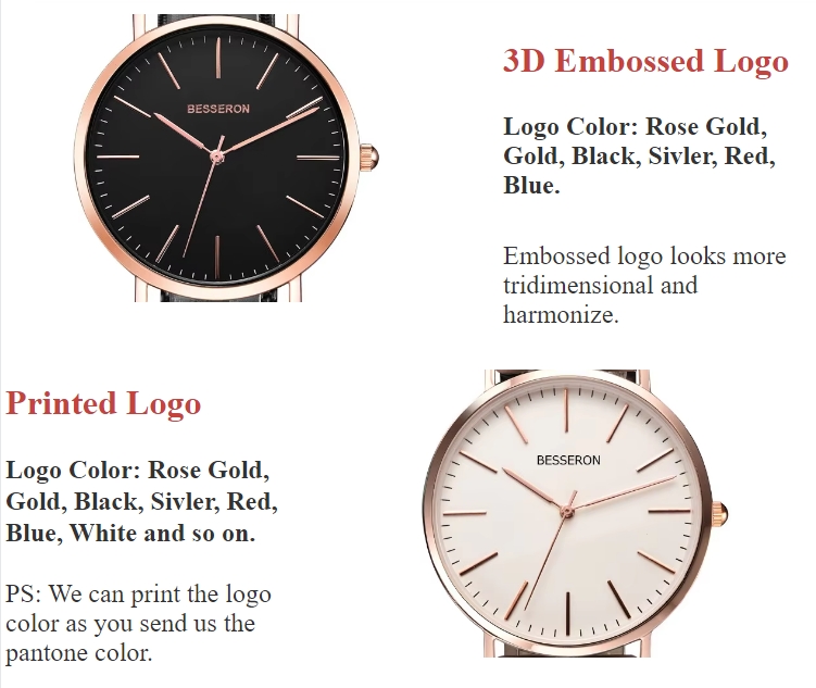 1. Q: What's the ordering process? A: Payment -----Mockup-----Machine drawing-----production----Quality check------Delivery 2. Q: How many quantities do I order to customize my logo? A: Our Watches models' minimum order quantity is 100pcs per design. We can customize your logo. 3. Q: Can I Mix The Straps If I order based on the MOQ? A: Yes, we have many bands for your choice, such as Brown and Black Genuine Leather, Gold, Rose Gold, Silver Mesh Black Metal Bands, etc. 4. Q: About the after-sales service: A: We are confident in our products, and we pack them very well, so you will receive your order in good condition. But to avoid any Regarding the quality issue, we suggest that you check the watches as soon as you receive them, and let us know the details if there are any damaged ones. We will deal with it accordingly and immediately. 5. Q: Why did you choose us? A: We have a lot of models with brand logos; you can also check them on Instagram and Facebook. Production takes only 15~45 days, depending on the designs.